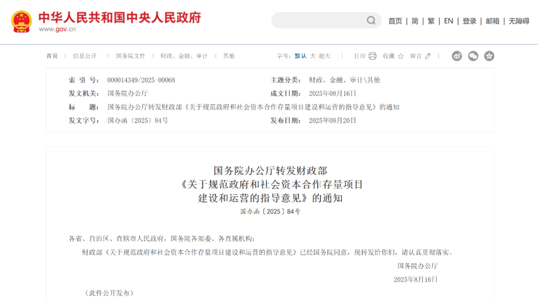 8月20日,國務(wù)院辦公廳轉(zhuǎn)發(fā)財(cái)政部《關(guān)于規(guī)范政府和社會(huì)資本合作存量項(xiàng)目建設(shè)和運(yùn)營的指導(dǎo)意見》(下稱《意見》),明確對(duì)于存量PPP(政府和社會(huì)資本合作)項(xiàng)目,地方政府要“依法履約按效付費(fèi)”,保障PPP在建項(xiàng)目順利建設(shè)、推動(dòng)已運(yùn)營項(xiàng)目平穩(wěn)運(yùn)行。